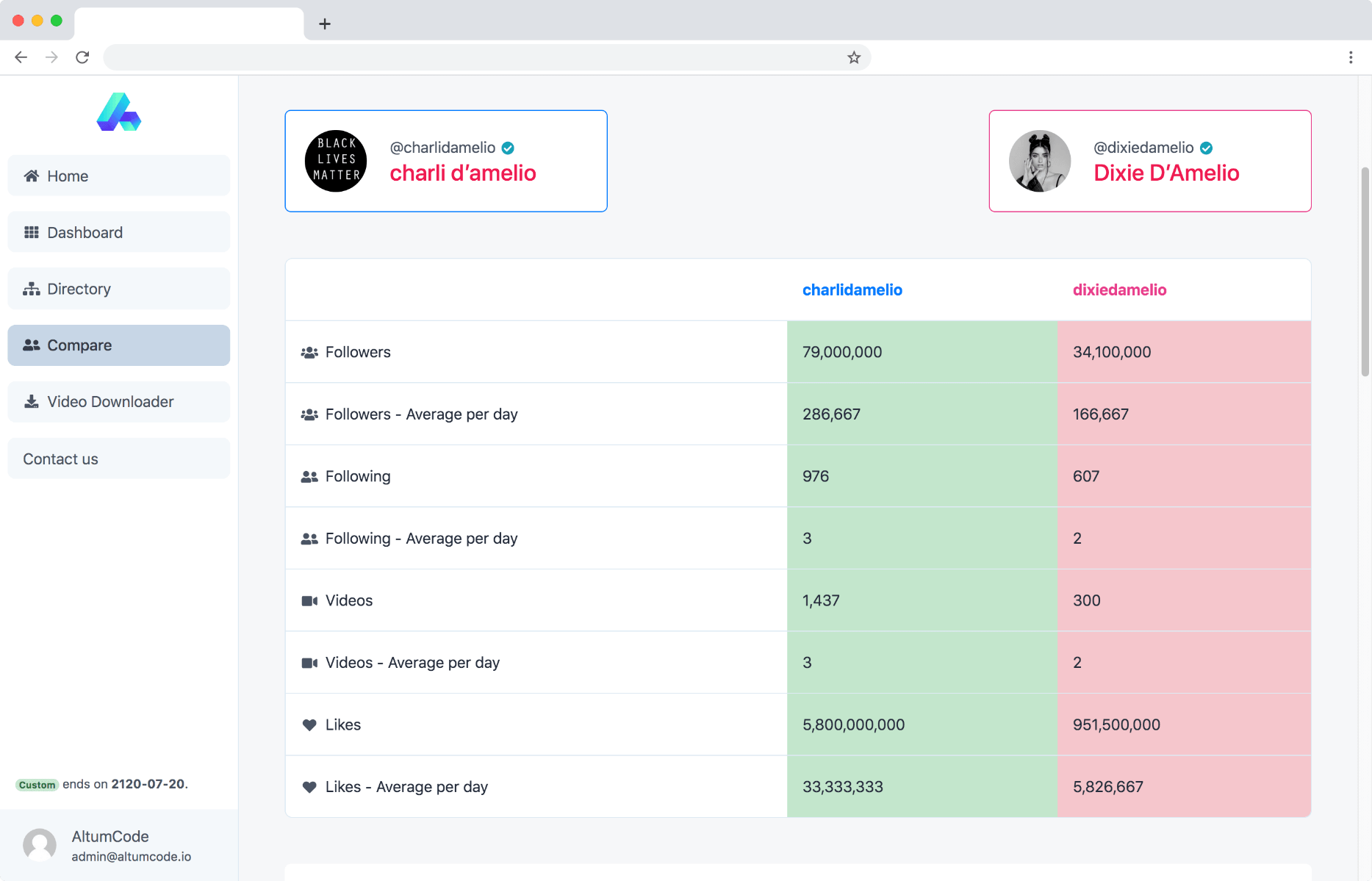 Compare 2 TikTok user accounts analytics very easily to find out which account growth is better.