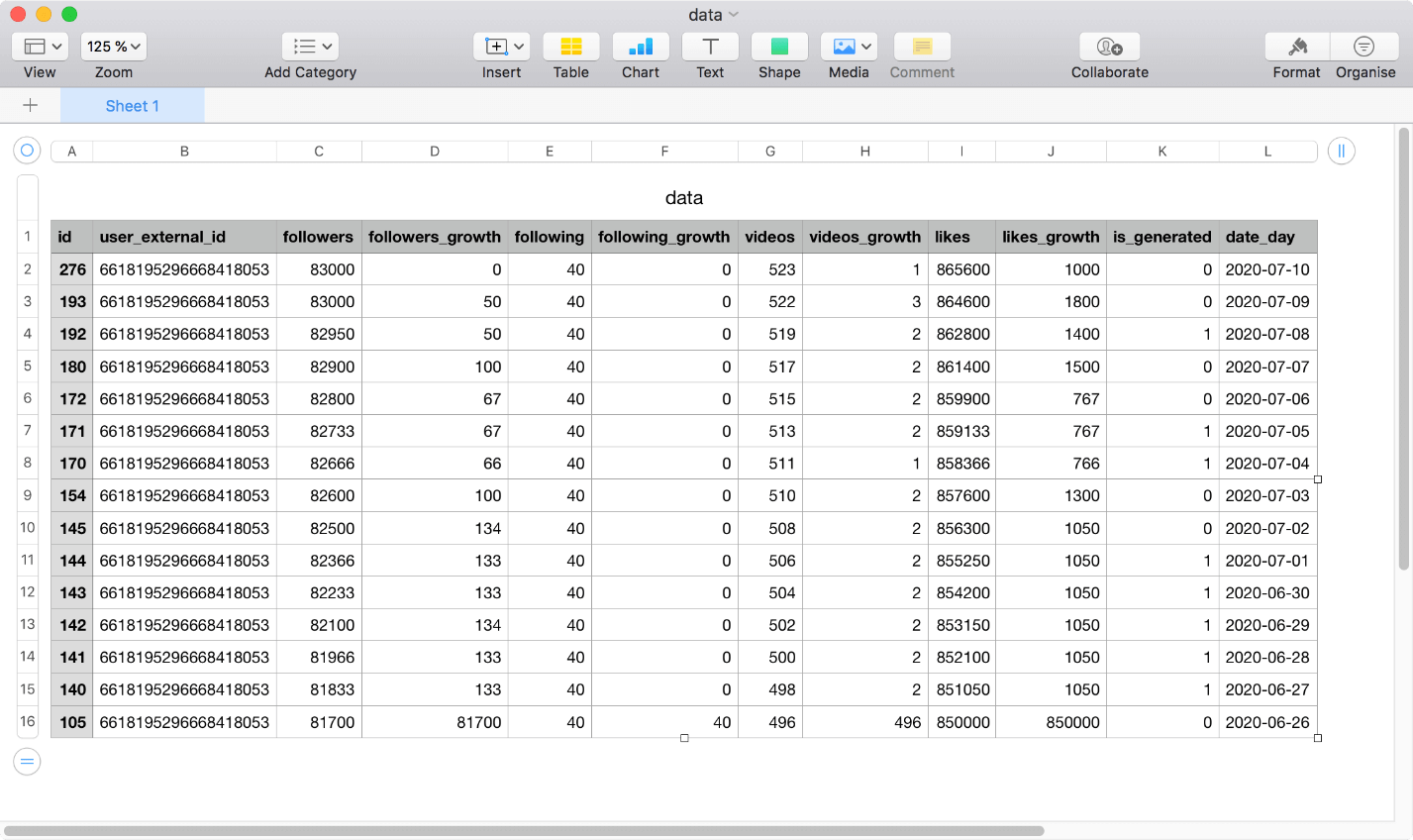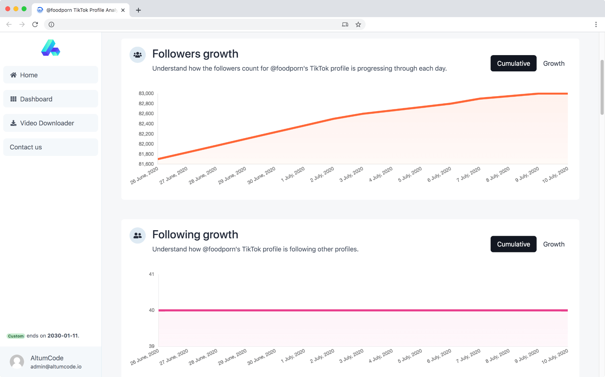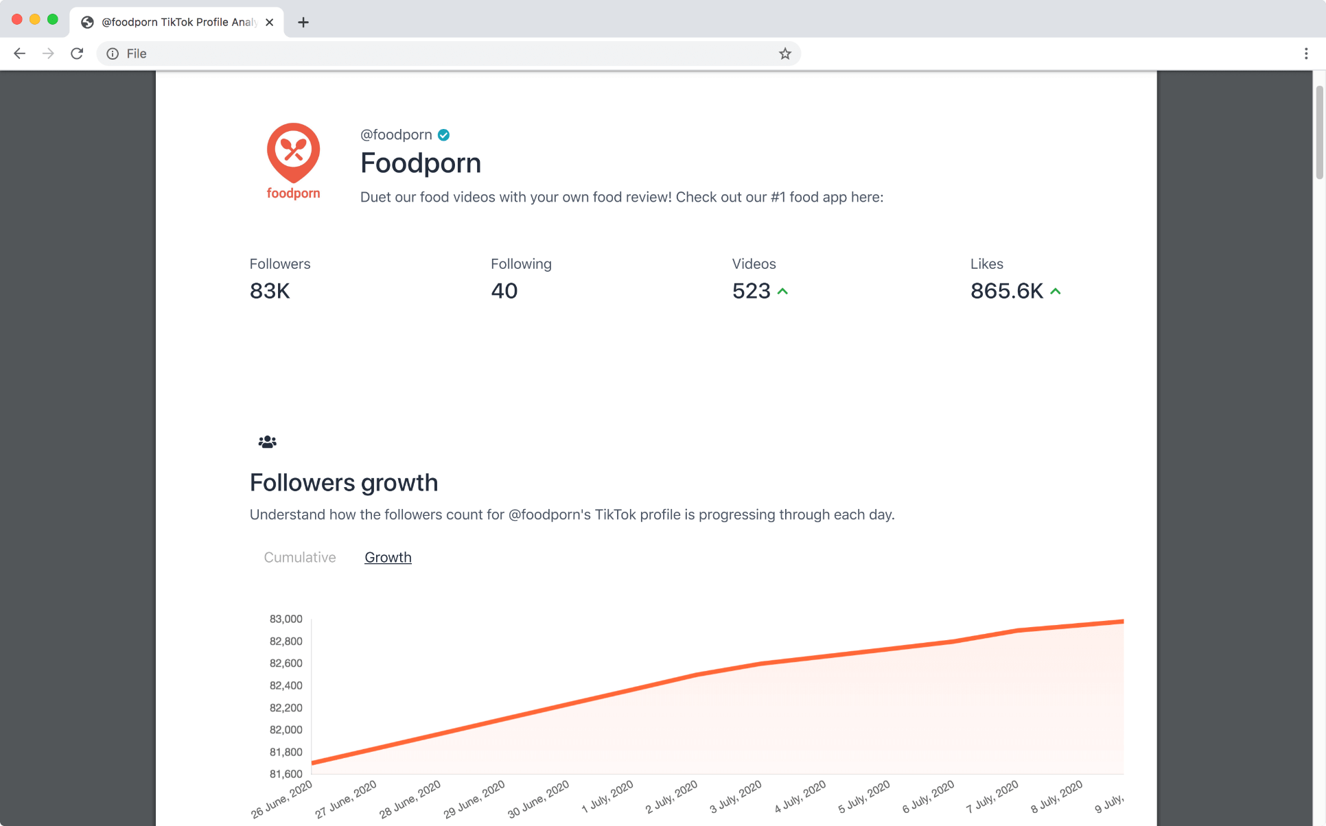 Analyze daily progress of any public TikTok user of their followers, following, videos and likes count.