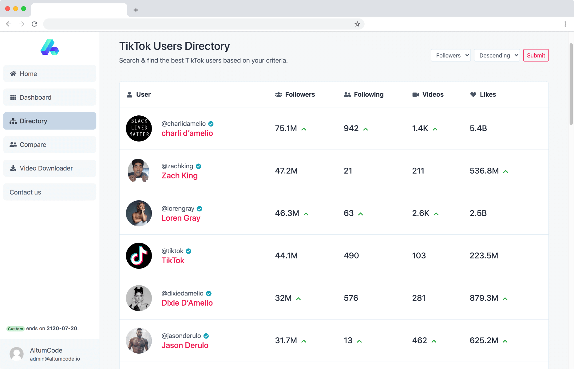 Easily search TikTok users and order them by your needed criteria.